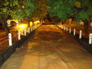 Uma forte chuva que caiu na noite desta terça-feira (27/11) em Itaperuna, Noroeste Fluminense inundou várias ruas em diversos bairros. As vias no entorno do Terminal Rodoviário João Paulo II, no Bairro Cidade Nova, ficaram impossibilitadas para os pedestres e em determinado momento nem mesmo carros baixos conseguiram passar.