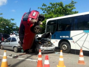 Um dos carros envolvidos no acidente, com a velocidade da batida, ficou praticamente em pé. A colisão ocorreu na avenida Prefeito Sílvio Picanço, na orla. O motorista vinha no sentido Jurujuba e teria passado mal, perdendo o controle da direção. Apenas ele e a cobradora estavam no veículo no momento da batida. Ninguém se feriu.