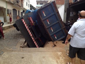 Caminhão servindo a Prefeitura afunda em canaleta e cobre motocicleta com asfalto