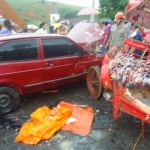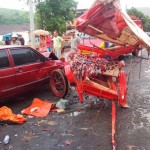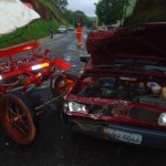 Segundo pessoas que testemunharam o acidente a charrete foi atingida com violência por trás pelo carro do policial e ficou toda espatifada jogando os seus ocupantes para o alto.