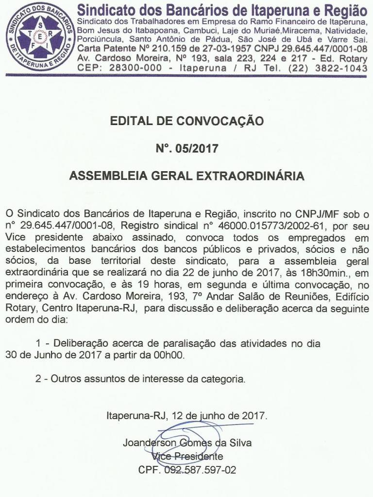 O Sindicato dos Bancários de Itaperuna e Região, que abrange os funcionários das agências de Itaperuna, Bom Jesus do Itabapoana, Cambuci, Santo Antônio de Pádua, Miracema, São José de Ubá, Laje do Muriaé, Natividade, Porciúncula e Varre-Sai, realizara assembleia nesta quinta-feira (22), às 19h, em sua sede, para definir a participação da categoria na mobilização nacional contra as reformas trabalhista e da Previdência, agendada pelas centrais sindicais do país para o próximo dia 30.