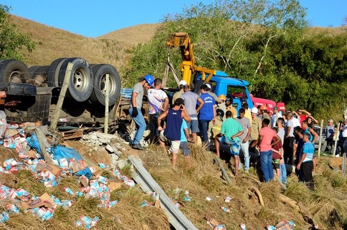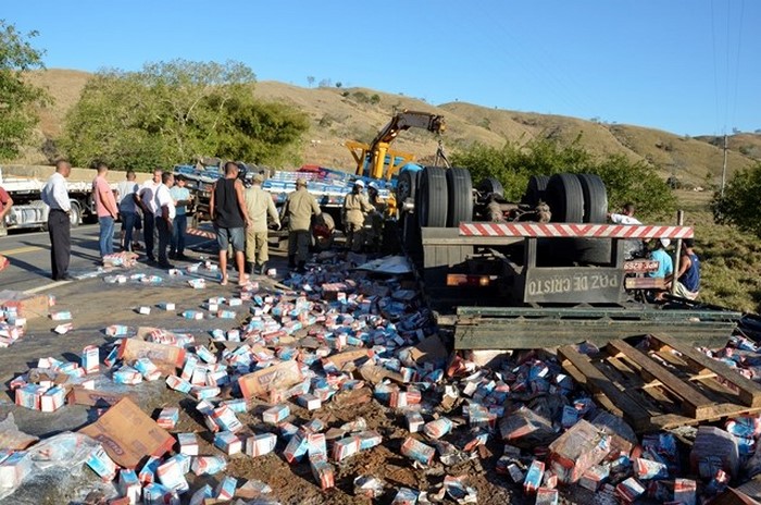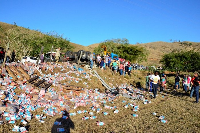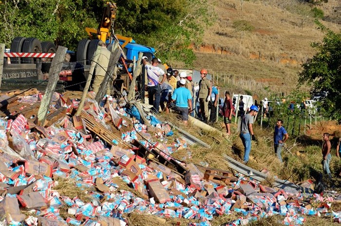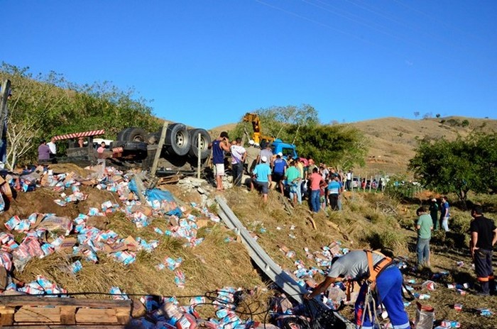 Um caminhão com placa de Linhares (ES), carregado com milhares de caixas de leite longa vida, sofreu acidente na tarde desta segunda-feira (28), na BR 356, no trecho que liga os municípios de Italva e Itaperuna. De acordo com informações do destacamento 3/21 do Corpo de Bombeiros, o motorista perdeu o controle da direção na altura do quilômetro 64, na “Curva do Homero Correia”, se chocou contra um poste e tombou às margens da via.