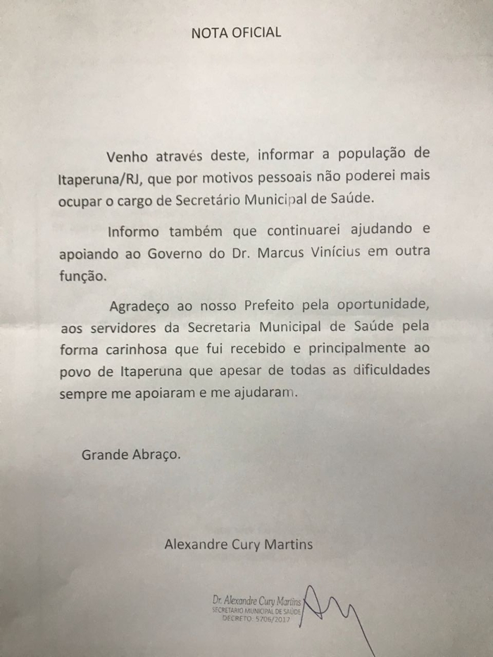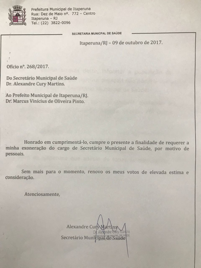 O Departamento de Comunicação da Prefeitura de Itaperuna informou na tarde desta segunda-feira (09) que o Dr. Alexandre Cury Martins não é mais secretário de Saúde do município. Segundo informações do órgão, o médico solicitou ao prefeito, Dr. Marcus Vinícius, a sua exoneração do cargo que ocupava desde o dia 1º de janeiro por motivo pessoal.