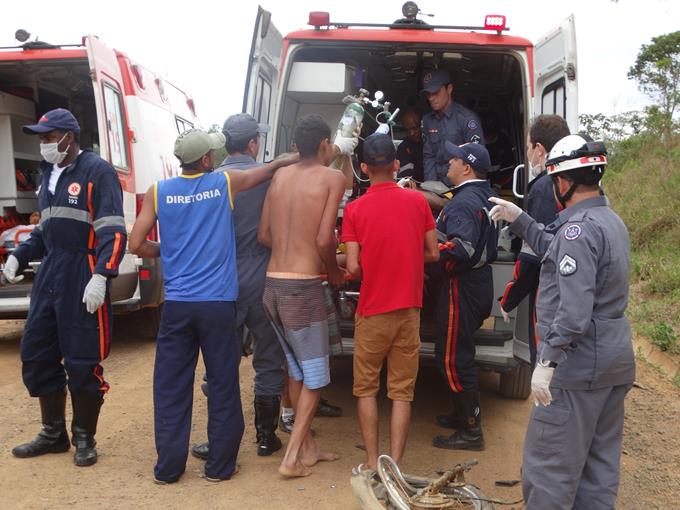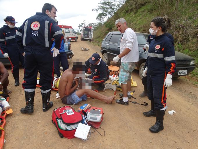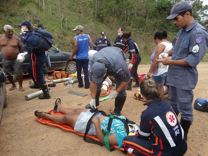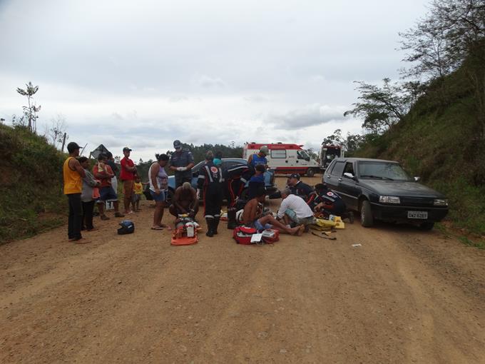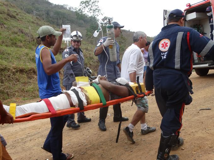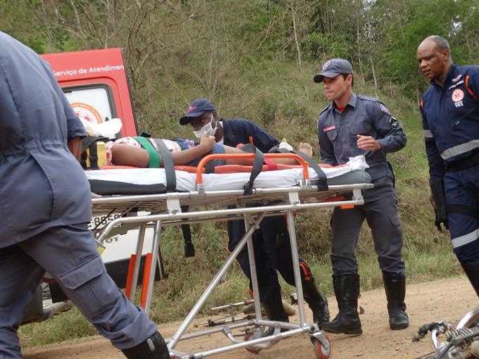 Uma motociclista ficou gravemente ferida na tarde deste sábado (04), em um acidente que aconteceu na estrada do distrito de Santo Antônio do Rio Preto (30 km de Muriaé). As primeiras informações obtidas pela nossa reportagem, que acompanhou o socorro das vítimas pelos Bombeiros e socorristas do SAMU, dão conta que a condutora da moto carregava duas pessoas na garupa da motocicleta, e teria perdido o controle da direção vindo a bater violentamente contra uma ambulância do SAMU que transportava um paciente da região para o Hospital São Paulo, em Muriaé.