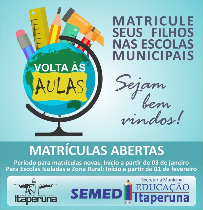 A SEMED (Secretaria Municipal de Educação de Itaperuna) informa que as escolas municipais estão iniciando as matrículas escolares dos novos alunos. As matrículas em escolas municipais de locais urbanos já iniciaram no dia 03 de janeiro. As matrículas em escolas isoladas e de zona rural iniciam no dia 03 de fevereiro.