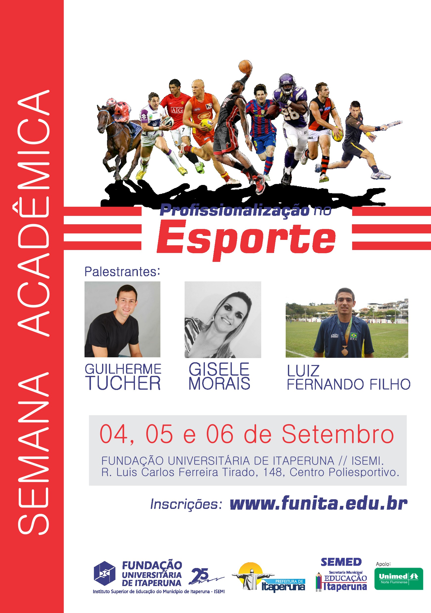 A Fundação Universitária de Itaperuna – FUNITA/Instituto Superior de Educação do Município de Itaperuna – ISEMI, promove com o apoio da Prefeitura e da Secretaria de Educação sua Semana Acadêmica, que será realizada entre os dias 04, 05 e 06 de setembro. Neste ano o tema será Profissionalização no Esporte.