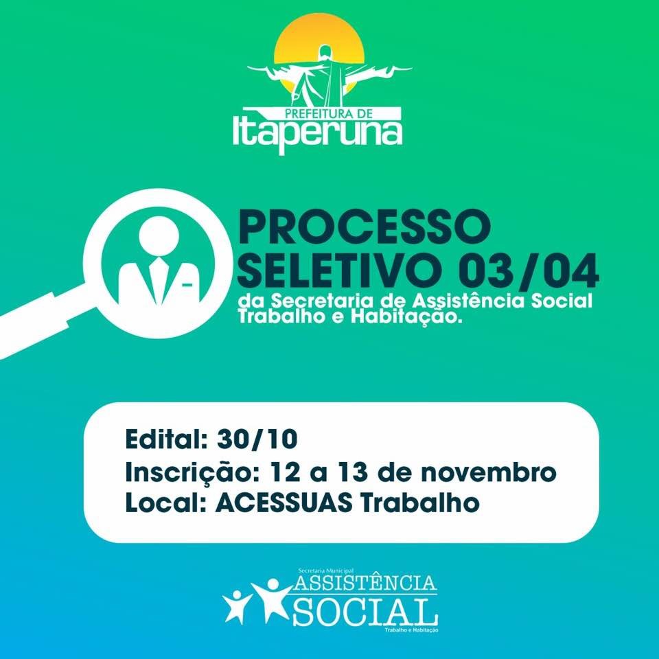 A Prefeitura de Itaperuna abre inscrições para o Processo Seletivo Simplificado, da Secretaria de Assistência Social destinado à contratação de servidores em regime de DESIGNAÇÃO TEMPORÁRIA para preenchimento de vagas e formação de cadastro e reserva com a finalidade de garantir a execução das atividades administrativas e operacionais da Proteção Social Especial, com os seguintes profissionais: Cuidador Social Diurno; Cuidador Social Plantonista e Auxiliar de Cuidador Social Plantonista.